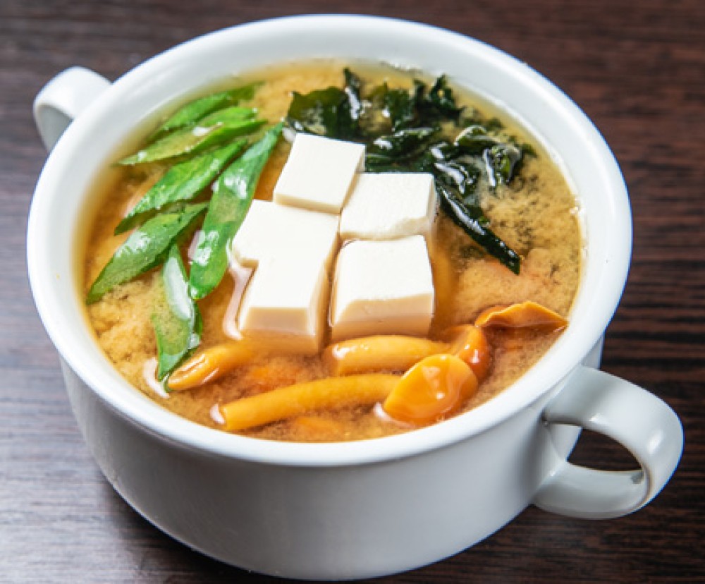 Мисо бульон, водоросли вакаме, грибы намеко, лук зеленый, кунжут