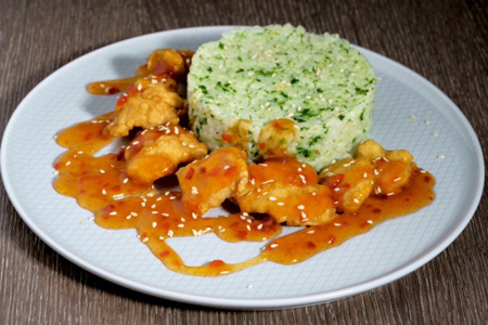 Филе куриное, кисло-сладкий соус, рис со шпинатом в сливочном соусе
