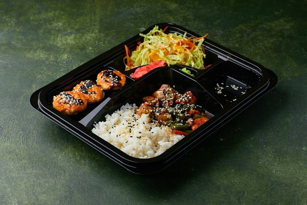 Говядина или курица в соусе терияки с рисом и овощами (фасоль стручковая, морковь,лук), зап. ролл с крабом, салат овощной, суп и напиток на выбор.
