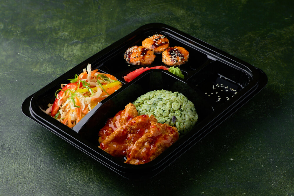 Окунь или курица жареная во фритюре с рисом со шпинатом и кисло-сладким соусом, зап. ролл с крабом, салат овощной, суп и напиток на выбор.