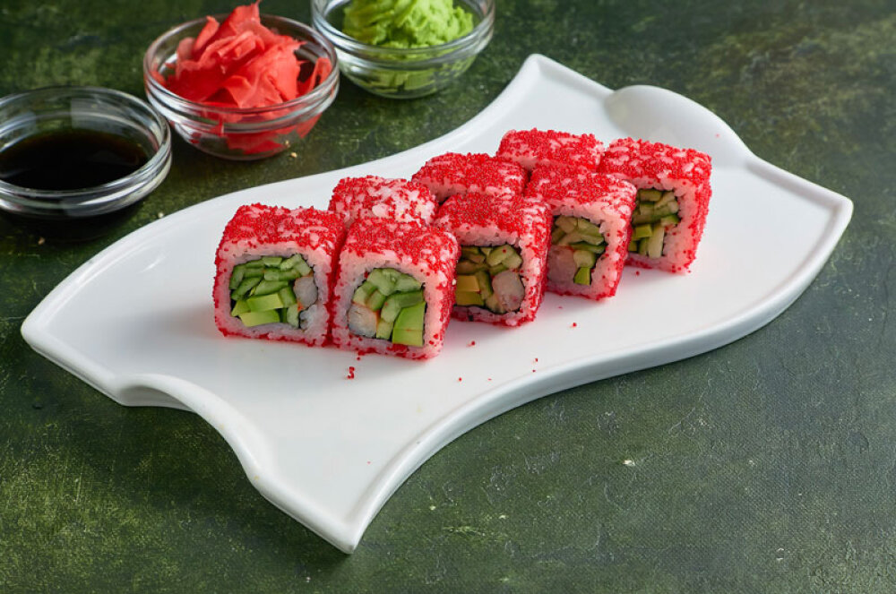 Креветка тигровая соус спайси, авокадо, огурец, икра масаго