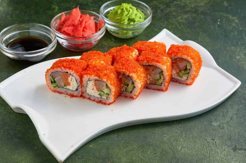 Лосось, окунь, снежный краб, огурец, икра масаго