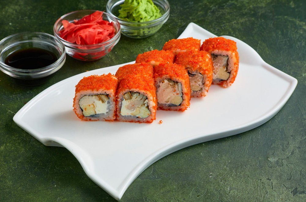 Угорь, сливочный сыр, томаго, курица гриль, икра масаго