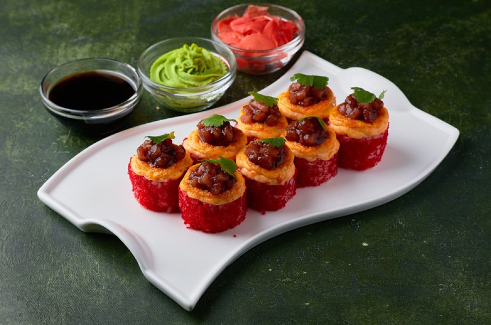 Тунец, томаго, такуан, капуста пекинская, лук, соус сырно-сливочный, икра масаго