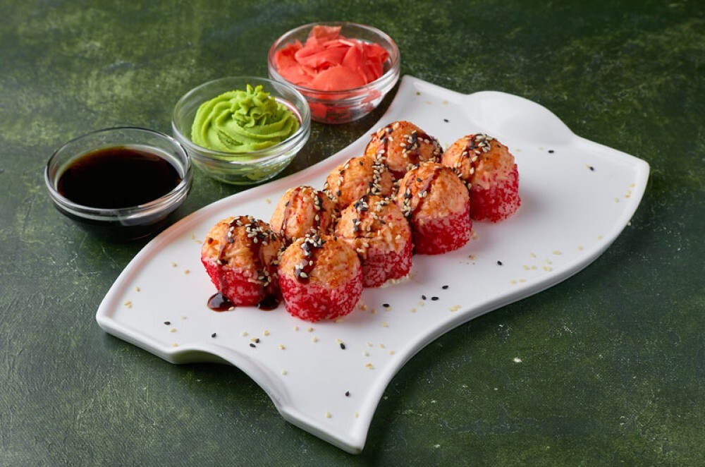 Краб, лосось, сыр сливочный, огурец, икра масаго, кунжут